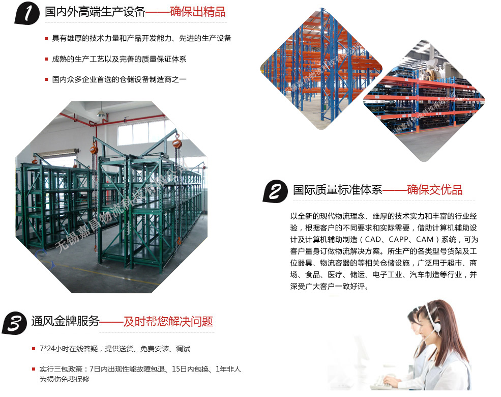無錫嘉昌倉儲貨架有限公司是國內現代倉儲物流技術開發(fā)、設計、生產和安裝的專業(yè)廠家,具有雄厚的技術力量和產品開發(fā)能力、先進的生產設備、成熟的生產工藝以及完善的質量保證體系。公司始終“以質量求生存,以信譽求發(fā)展的”的經營理念,放眼世界,積極引進、吸收國際物流行業(yè)先進技術,憑借專業(yè)的制作經驗、優(yōu)秀的產品質量,是國內眾多企業(yè)首選的倉儲設備制造商之一。